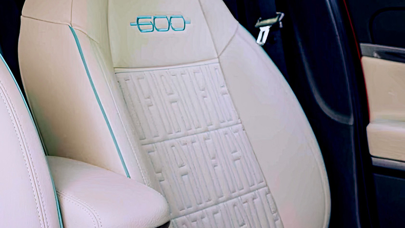 Lehne dich zurück und genieße den italienischen Lebensstil dank der Armaturenbretteinlage und den elfenbeinfarbenen Sitzen mit Fiat Monogramm und türkisblauem 600 Logo.